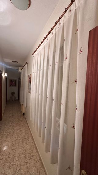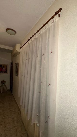 Cortinas blancas con un delicado bordado floral. - Diseño floral en tonos rojos y verdes. - Cuelgan de una barra de madera con anillas.