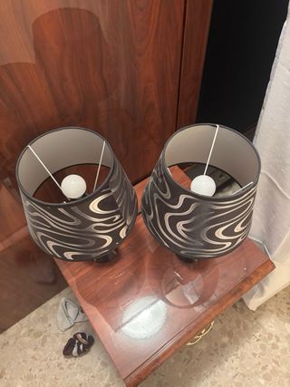 Vendo pareja de lámparas de mesa en muy buen estado. Tienen un diseño moderno y elegante, con base negra brillante y pantallas negras con dibujo ondulado en tonos claros, que aportan un toque sofisticado a cualquier estancia. Ideales para: • Mesillas de noche • Salón • Recibidor • Oficina o despacho Funcionan perfectamente. Se venden juntas. Estado: Muy bueno Entrega: En mano o envío por Wallapop