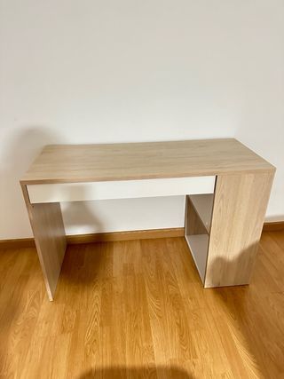 Escritorio con un diseño moderno y funcional, combinando acabados en madera y blanco. - Superficie amplia para trabajar o estudiar. - Compartimento de almacenamiento abierto. - Cajón integrado para guardar objetos.