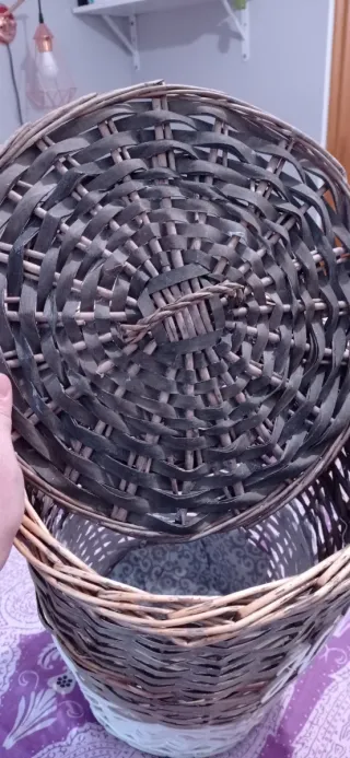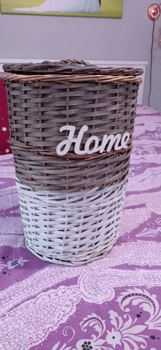 Cesto de mimbre con un diseño bicolor y la palabra Home decorativa. - Parte superior en tono marrón oscuro. - Parte inferior pintada en blanco. - Adorno de madera con la palabra Home.
