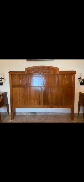 Conjunto de cabecero y pie de cama para cama doble. Pieza de mobiliario con un diseño clásico y elegante. Tiene agujeros de carcoma y desperfectos, algunos se ven en la fotografía. Cabecero: Alto 120 cm, ancho 154 cm, fondo 4,5 cm. Pie: Alto 95,5 cm, ancho 154 cm, fondo 4,5 cm. Barras: largo 190 cm. - Fabricado en madera. - Acabado en tono marrón.