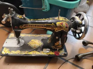 Máquina de coser de la marca Wertheim. - Diseño clásico en color negro con detalles dorados. - Construcción robusta con materiales de calidad. - Se puede restaurar o como mueble vintage