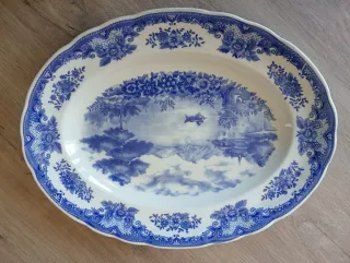 Conjunto de vajilla de porcelana con un diseño clásico en azul y blanco. - Piezas con motivos paisajísticos. - Incluye 1 plato llano grande de 30 cm, 10 platos hondos de 22 cm, 10 planos llanos de 26 cm, 1 fuente alargada grande de 37 cm, 1 fuente alargada mediana de 31 cm, 2 fuentes alargadas pequeñas de 22 cm, una ensaladera, una sopera, una cafetera, una lechera, un azucarero, una salsera con plato, una huevera y 9 tazas de café con su platillo. Regalo por tener pequeños defectos 4 platos llanos de 22 cm, un plato hondo de 22 cm, 12 platos llanos de 25 cm y 3 tazas de café con su plato