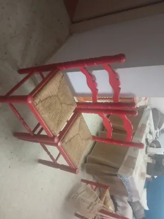 Conjunto de dos sillas con estructura de madera pintada en rojo y asientos de yute. - Diseño rústico y llamativo. - Asientos tejidos a mano.