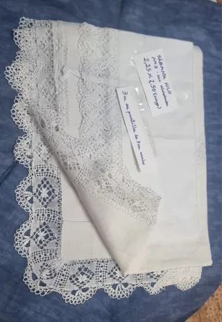 Juego de sábanas antiguas de hilo con un bonito encaje. - Sábana bajera y funda de almohada. - Medidas: 2,25 x 2,50 m. - Incluye 3 metros de puntilla de 8 cm de ancho.