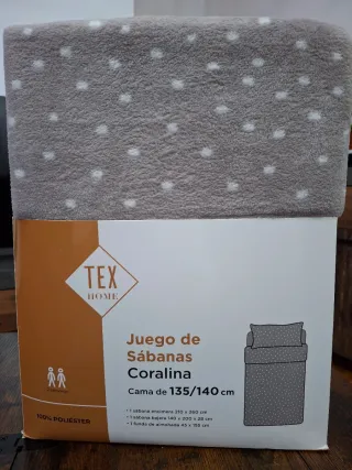Juego de sábanas de coralina para cama de matrimonio doble de 135 o 140cm de ancho y 190 a 200cm de largo. Mocha con topitos blancos. Incluye: - sábana bajera lisa de 140x200x28cm con goma ajustable en todo su contorno lo cual permite un perfecto ajuste a cualquier tamaño de colchón - sábana encimera de 210x260cm mocha con topos blancos. También se le puede dar uso como manta fina o para el sofá - funda de almohada mocha con topitos blancos de 45x155cm 100% poliéster. Tela gruesa, cálida y suave con tacto aterciopelado. Lavable en máquina, no necesita planchado. Totalmente nuevo. En las fotos aparece un producto idéntico que tengo