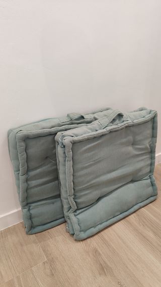 4 Cojínes cuadrados, para usar en el suelo o como asiento adicional en sillas, bancos, etc. Son prácticamente del mismo color, dos son un poquito más claros. - 60x60x10 cm. - Diseño con botones. - Con asas. - 100% algodón - Sin apenas uso, aspecto intacto sin roturas.