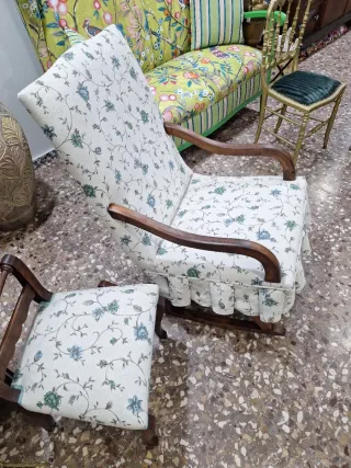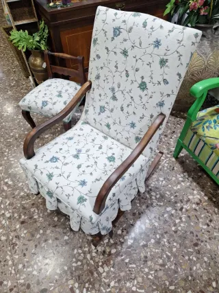 Mecedora tradicional de la Vega Baja con un encantador estampado floral. - Tapicería de tela con diseño de flores azules sobre fondo beige. - Estructura de madera oscura. - Diseño clásico con falda fruncida en la base.