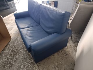Sofá de dos plazas y medio en polipiel azul. Se encuentra en buen estado. - Diseño moderno y cómodo. - Material de fácil limpieza.