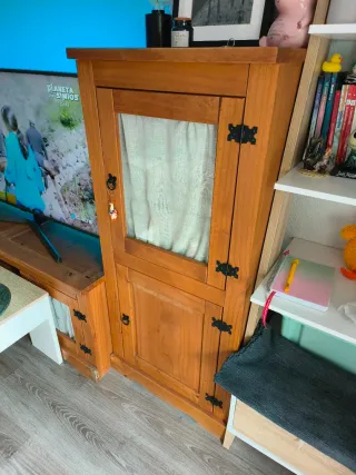 Armario de madera con un diseño clásico y elegante. - Puerta con cristal y detalle de cortina. - Tiradores de forja. - Estructura de madera maciza.