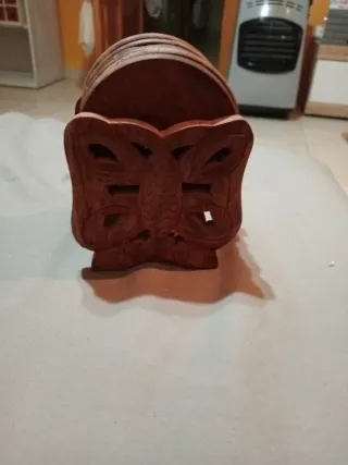 Conjunto de posavasos de madera con un diseño tallado. - Material: Madera. - Diseño: Tallado con motivos. - Color: Marrón.