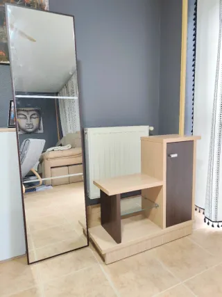 Mueble de recibidor con espejo. Ideal para organizar y dar un toque decorativo a tu entrada. Muy cuidado - Diseño moderno. - Acabado en madera clara y oscura. - Espejo de cuerpo entero. Medidas espejo: 1,50mts alto x 39cm ancho. Medidas mueble: 75cm largo x 25cm ancho x 72cm alto. SOLO VENTA EN PERSONA.
