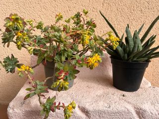 Dos suculentas en maceta, una Echeveria 'Serun Palmeri' y otra 'Tiburon'. - La 'Serun Palmeri' tiene hojas verdes con bordes rojizos y flores amarillas. - La 'Tiburon' presenta hojas alargadas y puntiagudas con manchas. - Ambas plantas están en macetas individuales. Lote 15 las dos.