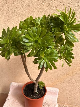 Planta suculenta de la especie Aeonium arboreum, también conocida como 'rosa de mar' o 'árbol del amor'. - Planta de interior o exterior. - Hojas verdes carnosas dispuestas en rosetas. - Tronco leñoso y ramificado.