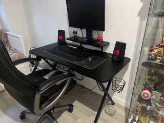 Mesa de escritorio de estilo gaming en color negro. Su diseño es moderno y funcional. - Estructura metálica robusta. - Superficie sintética de fácil limpieza.