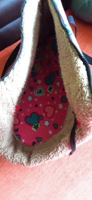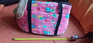 Bolso para mascotas con un diseño tierno y acogedor. - Estampado de corazones y flores. - Interior forrado para mayor calidez. - Asas resistentes para su transporte.