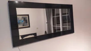 Se vende juego de dormitorio de 6 piezas en color negro lacado, acabado brillante sin rayaduras. * Espejo de pared de 100cm (ancho) x 50cm (alto) * 2 mesillas de 55cm (ancho) x 30cm (alto) x 40cm (profundidad), de dos cajones * Comoda de 100cm (ancho) x 73cm (alto) x 45cm (profundidad), de 4 cajones * Cabecero de 200cm (ancho) x 80cm (alto) * Canapé abatible de 150cm x 200cm Queen size (va de regalo, tiene un ligero desgaste) - Acabado lacado brillante. - Diseño moderno. - Apliques de metal