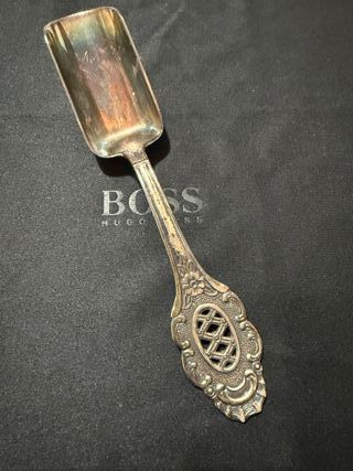 Cuchara 'tipo azucarera' de plata de diseño elegante, intrincada con detalles ornamentales. Mide 12'5 cm. Pieza especial y de pocas unidades. 3a generación. - Mango ornamentado con diseño floral y con patrón de rejilla. - Pala rectangular con acabado pulido. - Valor a acordar. Preferiblemente entrega en persona, tambien con envio.