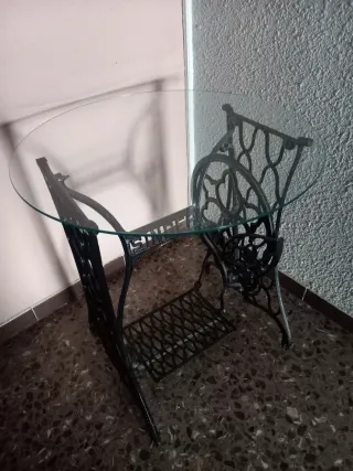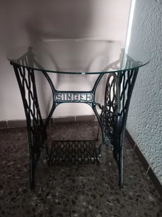 Mesa auxiliar con base de hierro fundido de máquina de coser Singer antigua y tapa de cristal. - Base de hierro fundido con detalles ornamentales. - Tapa redonda de cristal. - Diseño vintage.