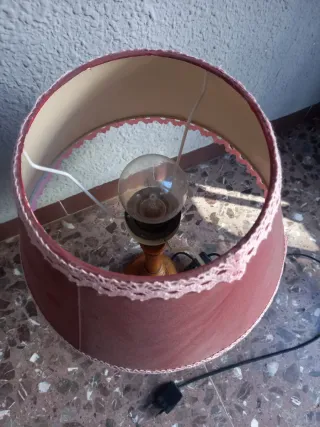 Pequeña lámpara de mesa con un diseño vintage y elegante. Perfecta para dar un toque acogedor a cualquier rincón. - Base de madera torneada. - Pantalla de tela con acabado en encaje rosa. - Interruptor en el cable.