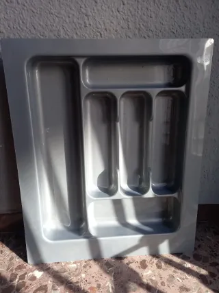 Práctico organizador de cubiertos para mantener tu cajón ordenado. - Fabricado en plástico resistente. - Diseño con múltiples compartimentos para diferentes utensilios. - Color gris neutro que combina fácilmente.
