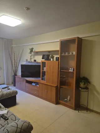Mueble de salón modular de madera con gran capacidad de almacenaje. Ideal para organizar tu salón. - Mueble de TV con estantes y cajones. - Vitrina con puertas de cristal. - Acabado en madera. Se vende montado. Si lo quieres, debes desmontarlo tu :) En Lleida. Medidas: - mueble bajo: 241 largo x 42 ancho x 63 alto - estante 1: 140 x 25 - estante 2: 160 x 25 - mini vitrina: 80 x 80 x 30 - vitrina grande: 60 x 30 fondo x 210