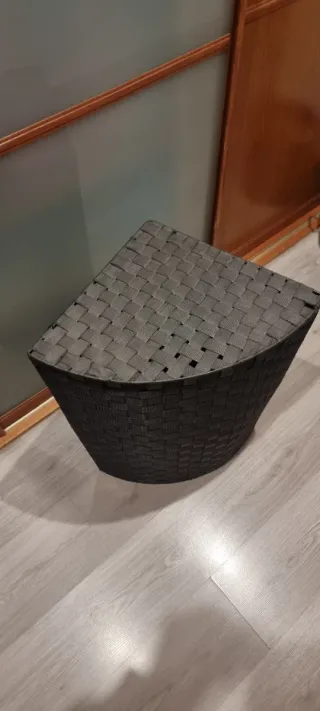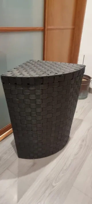 Práctico pongotodo con diseño tejido, ideal para esquinas. - Color: negro - Material: tela y mimbre.