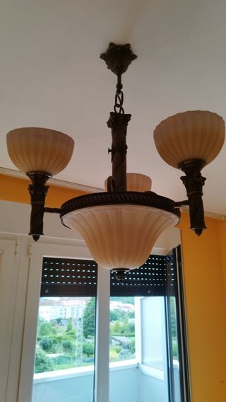 La lámpara está en perfectas condiciones, salvo el defecto de una de las tulipas, que no afecta al funcionamiento ni se desprende, se puede ver en la tercera foto, colgada queda oculto.
