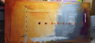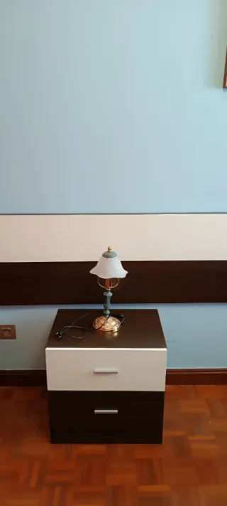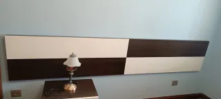 Conjunto de cabecero y dos mesitas de noche. - Diseño moderno con detalles en madera y blanco. - Mesitas con cajones para almacenamiento Medidas: Cabecero: 2,20 largo x 0,55 alto. Mesitas: 0,46 ancho x 0,43 fondo x 0,39 alto. Recogida en Santutxu, Bilbo