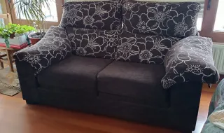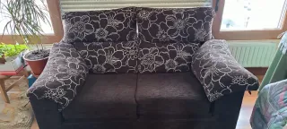 Conjunto de dos sofás, uno de 3 plazas y otro de 2 plazas, con un diseño de estampado floral. - Tapicería de tela. - Diseño de flores blancas sobre fondo marrón. Recogida en Santutxu, Bilbo.