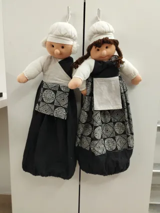 Set de cocinero y cocinera de trapo, ideales para colgar y guardar bolsas en su interior. - Diseño con delantal y gorro de chef. - Por la parte de atrás de la falda tienen una abertura para meter bolsas. - Las bolsas se sacan por la parte de abajo de la falda. Se hacen envíos y también se entrega en mano. Tengo más cosas de menaje en mi perfil.