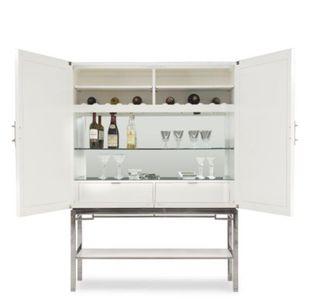 Elegante mueble bar con un diseño moderno y funcional. Perfecto para almacenar y exhibir tus bebidas y copas. - Combinación de acabados en blanco y plateado. - Estructura robusta de metal y madera. - Superficies de cristal para un toque sofisticado.