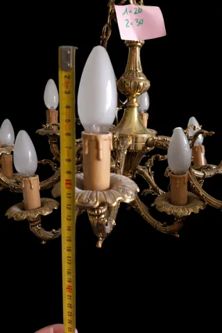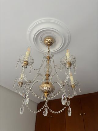 Elegante lámpara de araña con detalles de cristal y metal. - Diseño con múltiples brazos. 50cm de diametro. - Cristales colgantes decorativos. - Acabado dorado en la estructura. -Seminueva, se quita por reforma de hogar