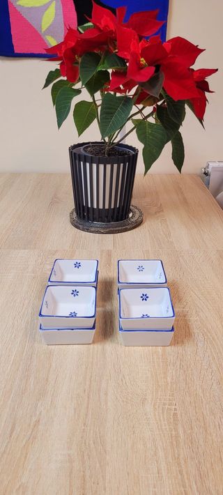Conjunto de ocho cuencos cuadrados con un diseño floral. - Cada cuenco tiene un borde azul. - Presentan un pequeño detalle de flor azul en el interior.