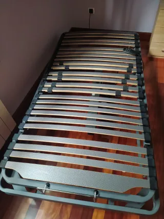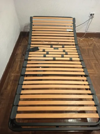 Base de cama articulada eléctrica de 90cm. - Estructura de metal y láminas de madera. - Mando a distancia para ajustar la posición. Regalo colchón con funda con cremallera. Tengo dos camas. El precio indicado es por cama.