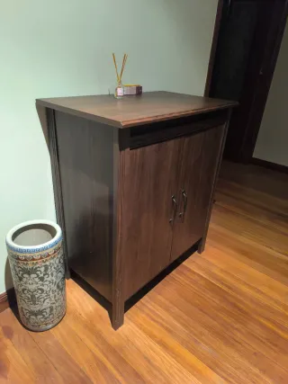 Armario de madera con un acabado en tono marrón. 80x40x120cm NO SE ENVIA! Opción de dos unidades por 18€ - Diseño de dos puertas. - Tiradores negros.