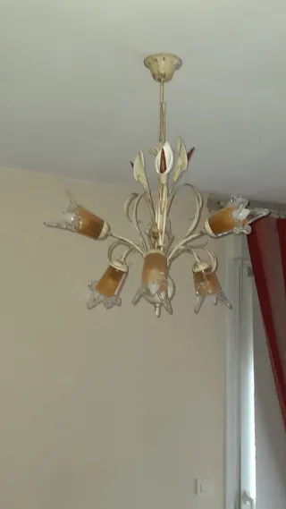 Elegante lámpara de techo con un diseño floral. - Mide 0,72 cms de alto, se puede regular la altura - Estructura metálica en color beige. - Tulipanes de cristal transparente y ámbar. - Regalo las bombillas