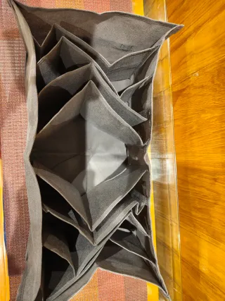 Práctico organizador con múltiples compartimentos para mantener tus cosas en orden. Su diseño permite aprovechar el espacio de forma eficiente. - Fabricado en tela resistente. - Color gris neutro. - Son 3, uno gris más grande, que es el de la fotos abierto y 2 de color blanco como el de la foto. - Están sin usar - Todos 7 €