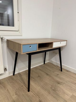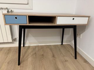 Escritorio moderno con un diseño funcional y atractivo. - Acabado en madera clara. - Un cajón de color azul. - Un cajón de color blanco. - Compartimento central abierto.