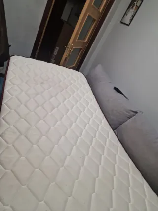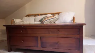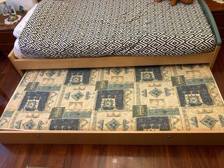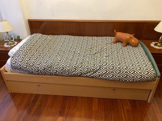 Cama nido de 90x190cm. - Estructura de madera en buen estado. Solo unos rasguños en la parte de los pies -La cama de abajo se saca muy facil, con ruedas y se eleva hasta la misma altura que la otra. La regalo con los dos colchones.