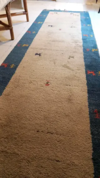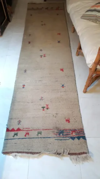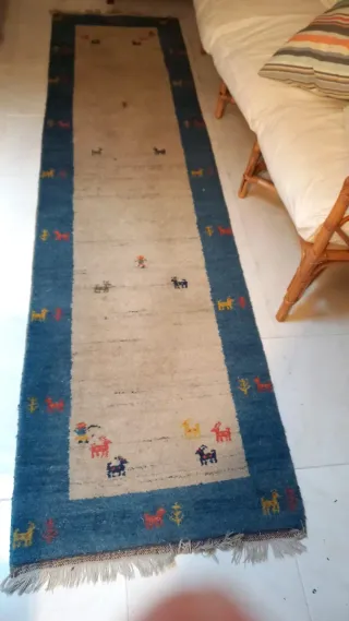 Alfombra de pasillo con un diseño único y llamativo. - Diseño con motivos de animales y figuras. - Borde azul - Flecos en los extremos.