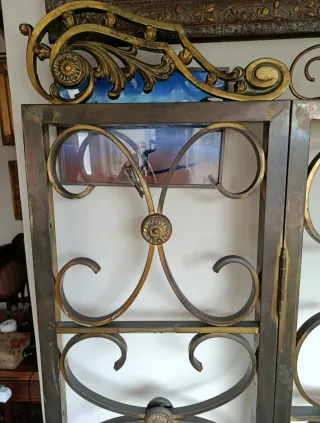 Conjunto de dos puertas reja de latón con un elegante diseño ornamental. - Fabricadas en latón. - Detalle de volutas y rosetones. - Acabado en tonos dorados y oscuros. Medidas totales : 1,65 de alto x 2,12 de ancho. Cada puerta mide 1,06 en dos hojas de 0,63 y 0,43.