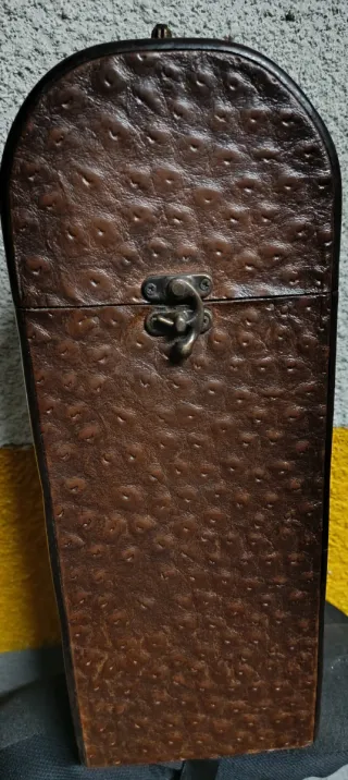 Elegante caja para botella de vino, ideal para regalar o transportar. - Diseño texturizado. - Cierre metálico. - Sin usar.
