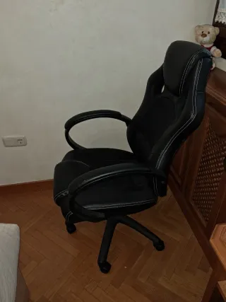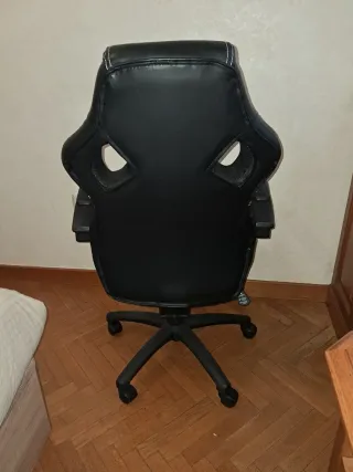Silla de escritorio con un diseño ergonómico y moderno. Es cómoda y funcional para tu espacio de trabajo o juego. - Base con ruedas para fácil movilidad. - Respaldo con cortes distintivos. - Costuras blancas decorativas.