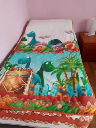 Conjunto de dos fundas nórdicas ajustables con un divertido diseño de dinosaurios. Cómodas, funcionales y en perfecto estado. Incluye los rellenos nórdicos. Para camas de 190x90. - Diseño: Dinosaurios. - Estilo: Infantil.