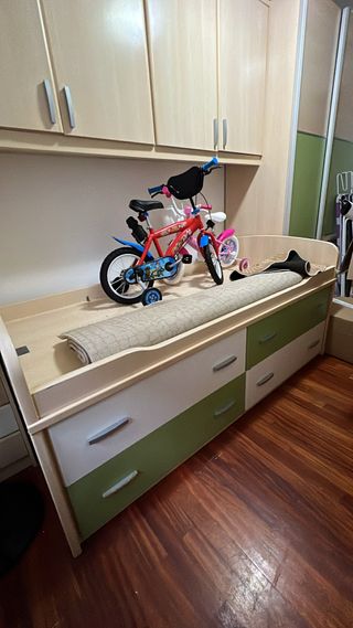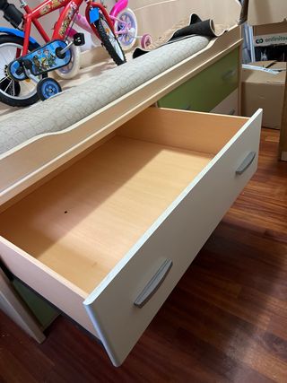 Cama individual de 90cm con un diseño moderno y funcional. - Combina acabados en beige y verde. - Estructura principal de madera. Recogida y desmontaje a cargo del comprador
