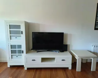 Conjunto de muebles para salón lacados en blanco. Compuesto por una vitrina, un mueble tv, una mesa de centro y dos estanterías. Medidas en cm (ancho×fondo×alto): - Vitrina: 60x40x154 - Mueble tv: 130x55x47 - Mesa de centro: 60x60x51 - Estantería 1: 120×25x4 - Estantería 2: 110x25x5 Tal y como se observa en una de las fotos, un cajón del mueble tv tiene un golpe en la parte trasera, pero no afecta a su utilidad y tampoco se ve.