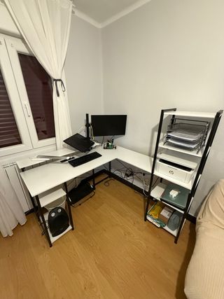 Escritorio de Amazon muy espacioso y cómodo. La esquina se puede colocar hacia ambos lados. Con cuatro meses de uso.