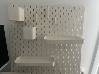 Conjunto de accesorios SKÅDIS de Ikea, ideal para organizar tu espacio. El set incluye 7 piezas. Si lo compras en este anuncio es solo los accesorio, no incluyo tabla. - 2 recipiente para lápices. - 2 balda. - 2 ganchos. - 1 pinza Se vende con tablero en otro de mis anuncios.
