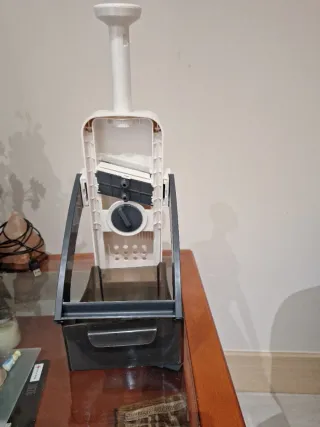 Cortador de verduras manual para la cocina. - Diseño compacto y fácil de usar. - Incluye diferentes cuchillas para cortar. - Recipiente para recoger los alimentos.